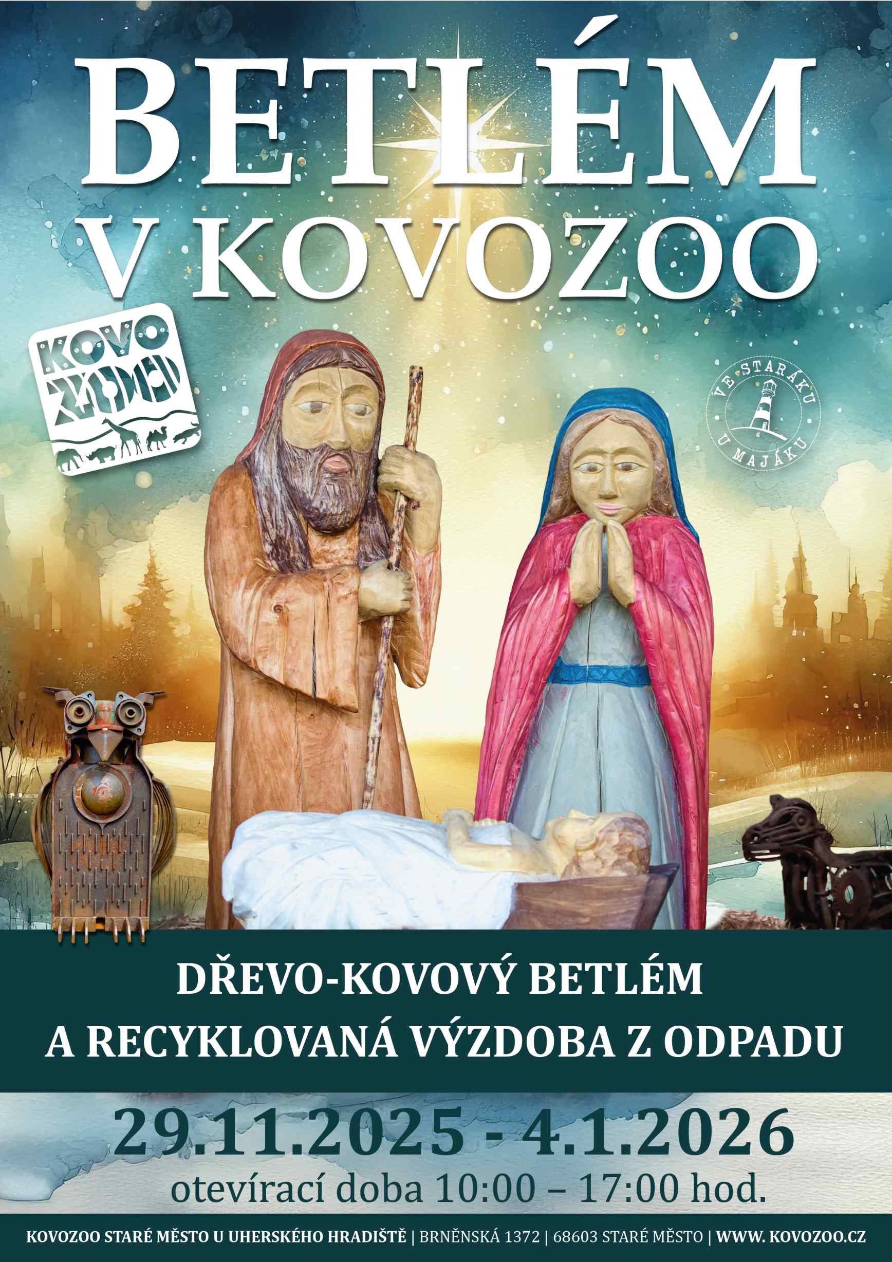 Poprvé jsme betlém v KOVOZOO vystavili na Vánoce 2018 po téměř roční přípravě, kterou zabrala výroba 8 lidských postav a jednoho anděla. Postavy jsou vyřezány z kmene topolu. Expozice dřevěných soch je doplněna skulpturami zvířat z expozice KOVOZOO. A že je z čeho vybírat! Máme jich již přes 500. Aby byla vánoční atmosféra dokonalá, prosvětlili jsme celý areál téměř třemi kilometry světelných řetězů. Rozhledna maják Šrotík již tradičně oblékla kabátek z červených vánočních světýlek a ukazuje všem, kteří plavou v moři odpadů tu správnou „eko“ cestu.