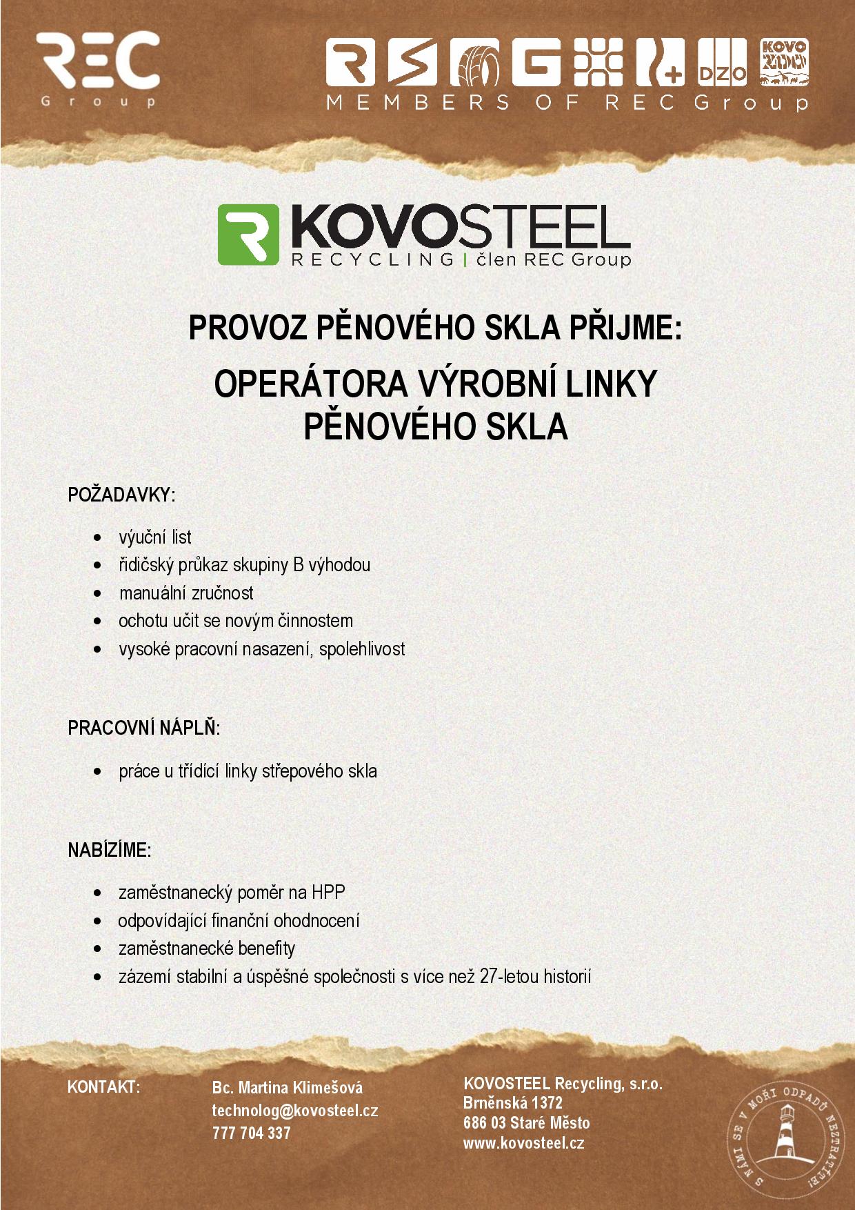 Pokud se chcete zařadit do databáze uchazečů o práci ve společnostech skupiny REC Group, zašlete nám Váš životopis na mailovou adresu technolog@kovosteel.cz společně se SOUHLASEM KE ZPRACOVÁNÍ OSOBNÍCH ÚDAJŮ (souhlas si stáhněte v odkaze níže, vyplňte, podepište a vyfocený nebo naskenovaný pošlete zároveň s Vaším životopisem).