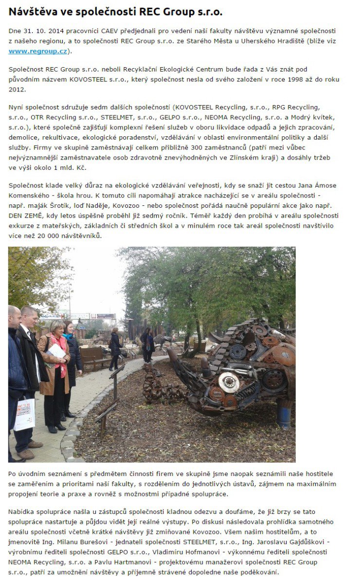 Role hostitelů se ujali jednatel společnosti STEELMET – Ing. Milan Bureš, výrobní ředitel společnosti GELPO – Ing. Jaroslav Gajdůšek, výkonný ředitel společnosti NEOMA Recycling – Vladimír Hofman a projektový manažer společnosti REC Group – Pavel Hartman. Tito seznámili vedení UTB s předmětem činnosti firem ve skupině REC Group a poté naopak oni seznámili nás se zaměřením a prioritami fakulty, s rozdělením do jednotlivých ústavů, zájmem o maximálním propojení teorie a praxe a rovněž s možnostmi případné spolupráce s námi.