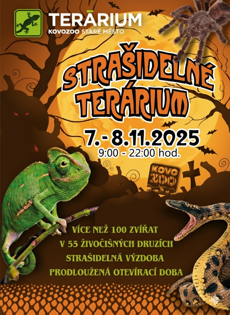 V sobotu 8.11.2025 probíhá v čase 15:00 – 21:00 hod. v areálu KOVOZOO akce STRAŠIDELNÁ ZAHRADA. Vstupenka na tuto akci nezahrnuje vstupné do TERÁRIA.